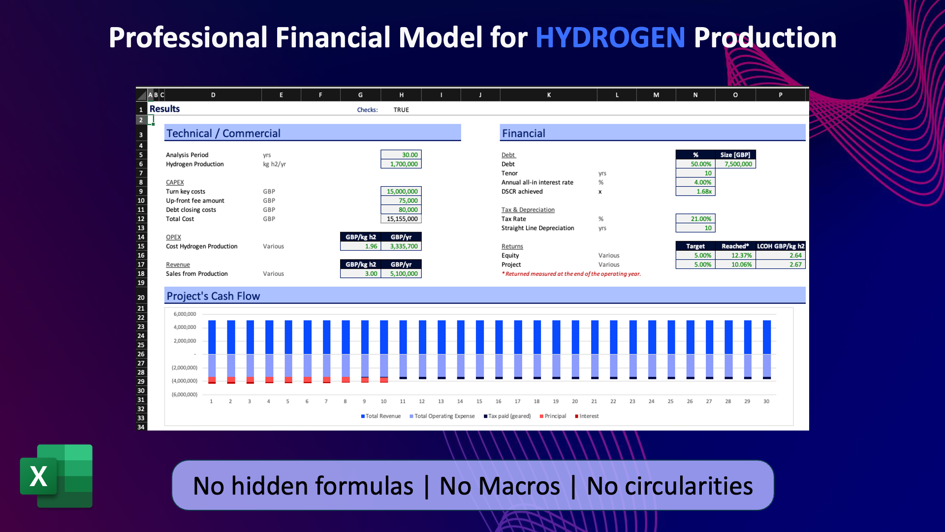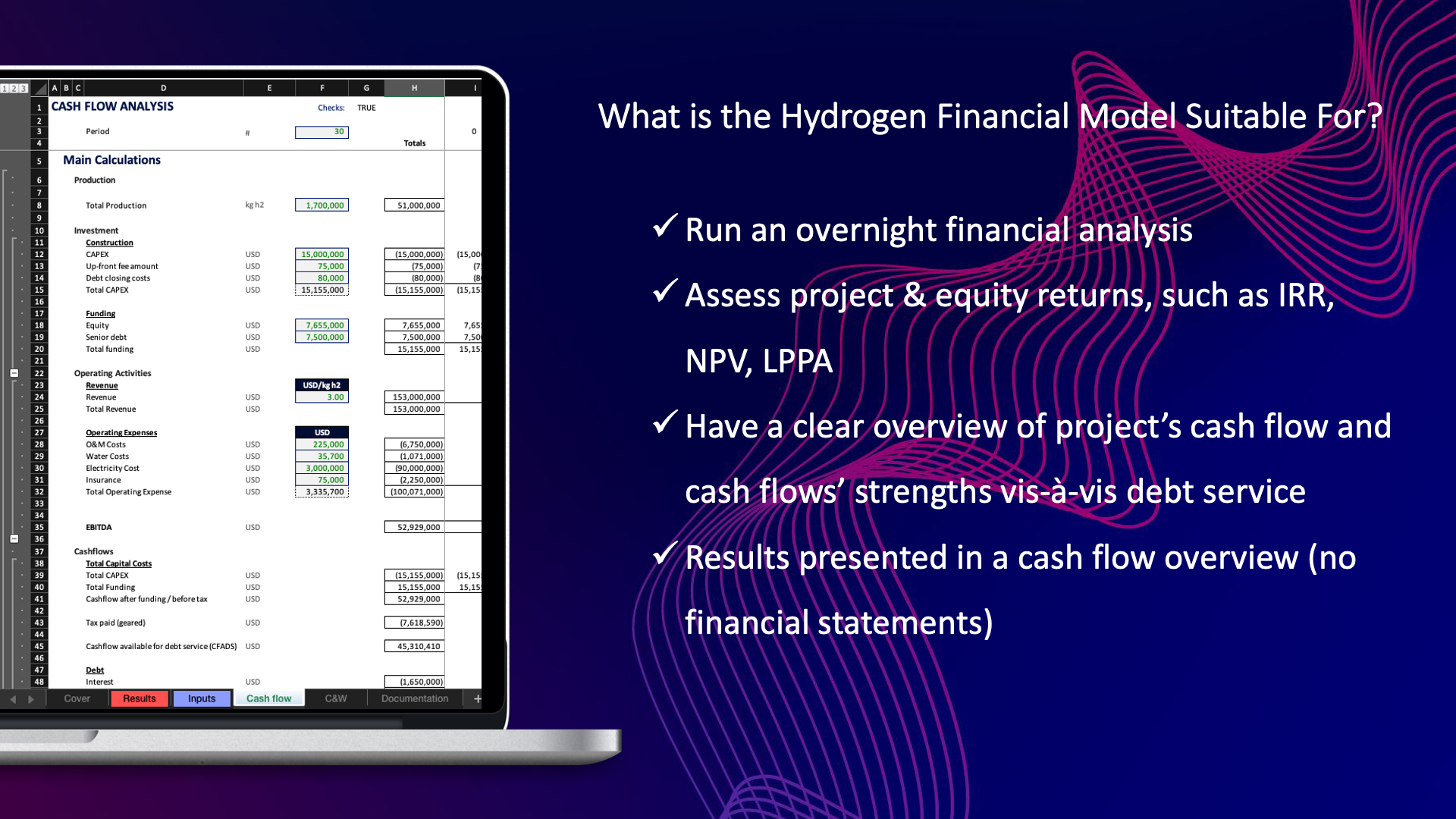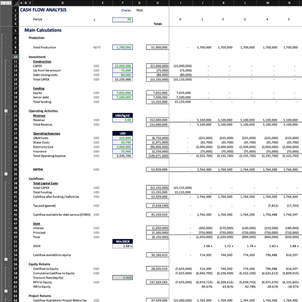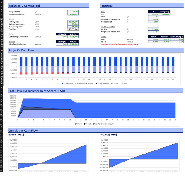 The financial model offers a straightforward approach to assess the overnight returns of hydrogen projects. It includes cash flow analysis calculations and a user-friendly dashboard to present the results. With this model, you can determine the project's :