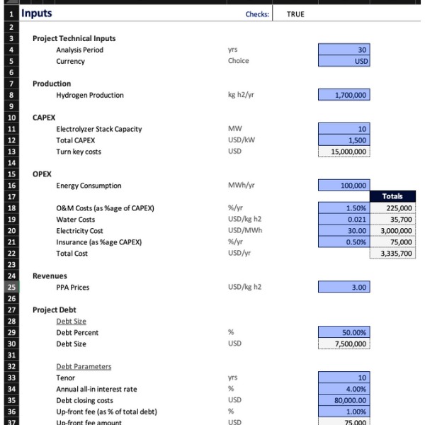 - Levelized Cost of Hydrogen (LCoH) at both the project level (without debt) and for equity investors (with debt),