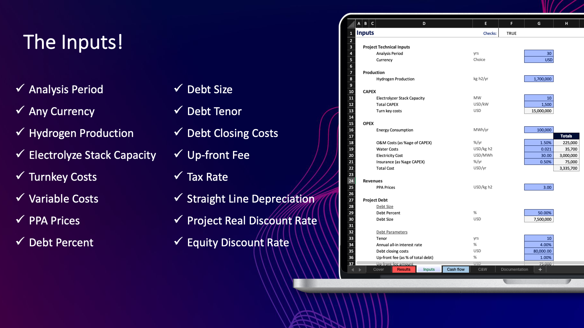 - Results: a dashboard with the main inputs and all of the outputs, including 8 graphs presenting the cash flows and returns of the project.